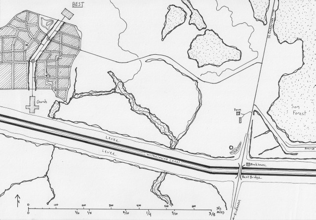 The weapons company reinforces the bridge with a machinegun platoon and a mortar platoon. They get sited; but, have no time to dig in before the German artillery barrage begins. A trio of 7.5 cm infantry guns, operating from Best, walks a trail of fire along the raised roadbed just north of the canal. The barrage lasts for only a minute or two, as the German’s artillery ammunition supply is terribly short. The intended effect is to screen the advancing infantry, sow confusion, and to cause casualties – in that order.
